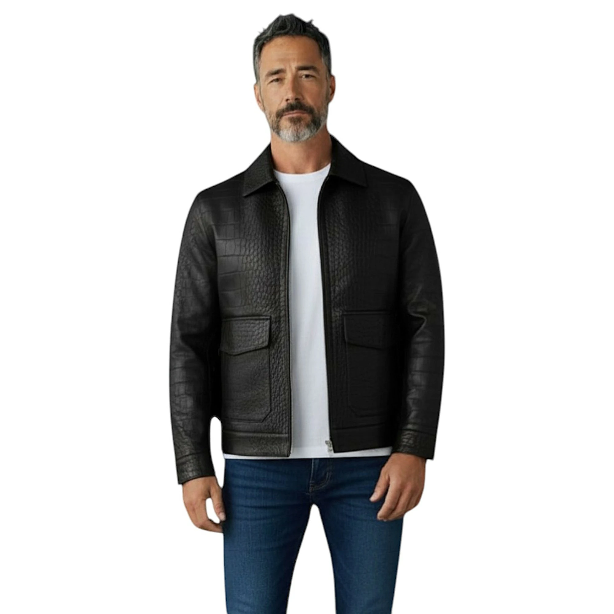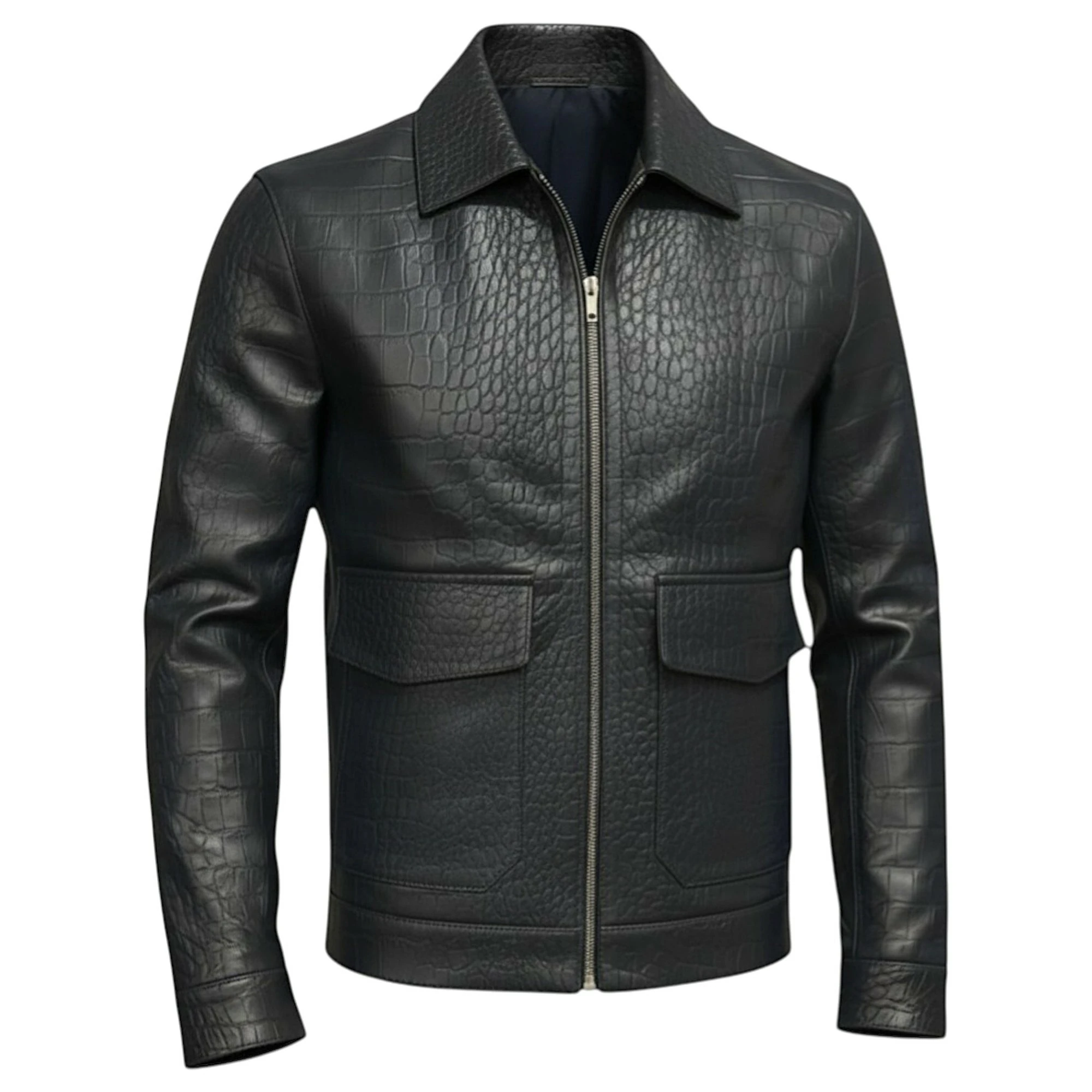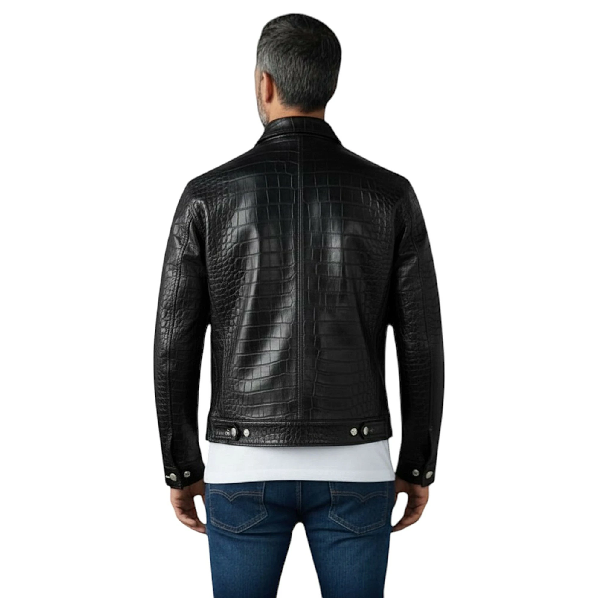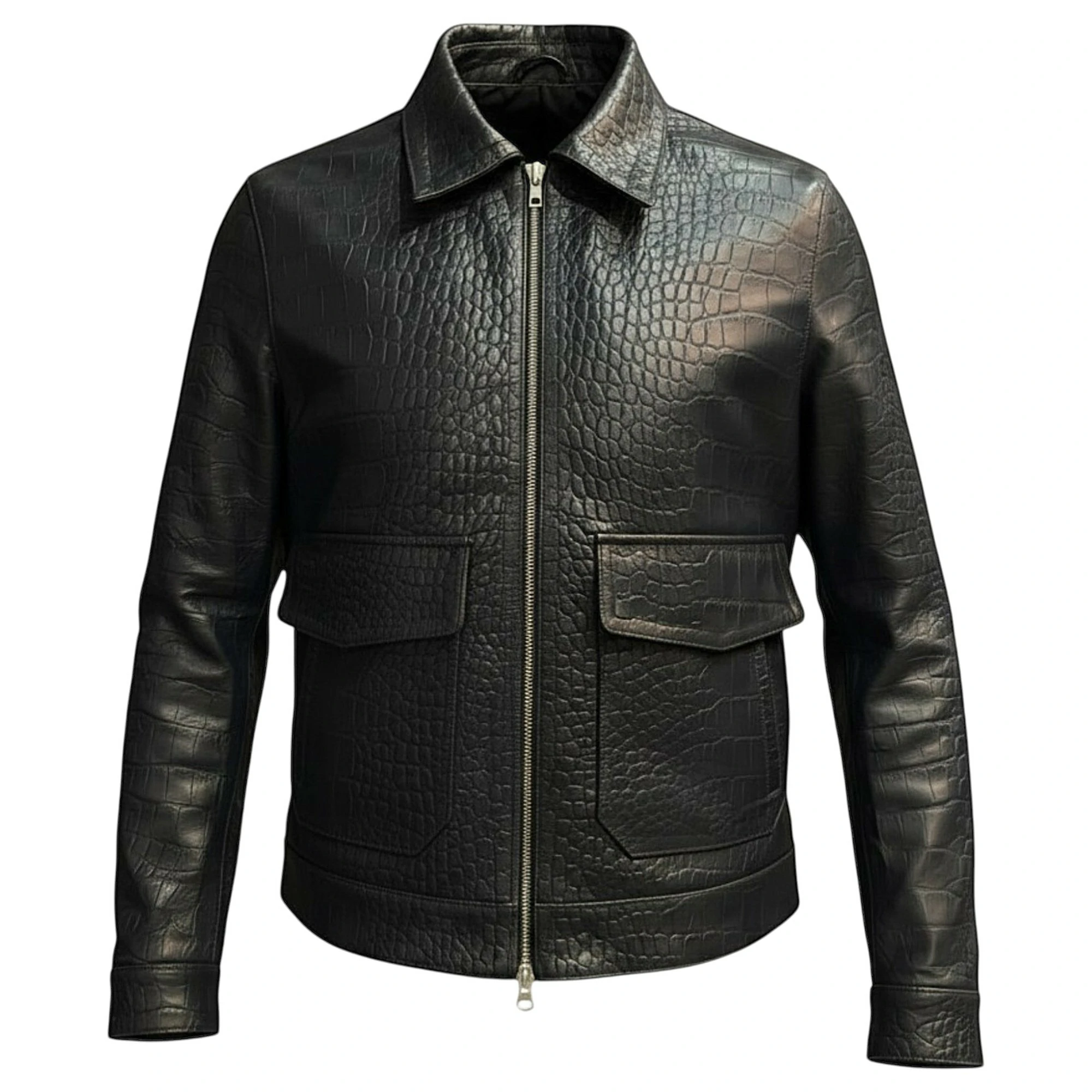 Elevate your wardrobe with this premium Jacket, a perfect combination of modern fashion and timeless craftsmanship. Designed for individuals who appreciate luxury and bold style, this jacket stands out with its distinctive crocodile-textured front panel and sleek, smooth leather sleeves.