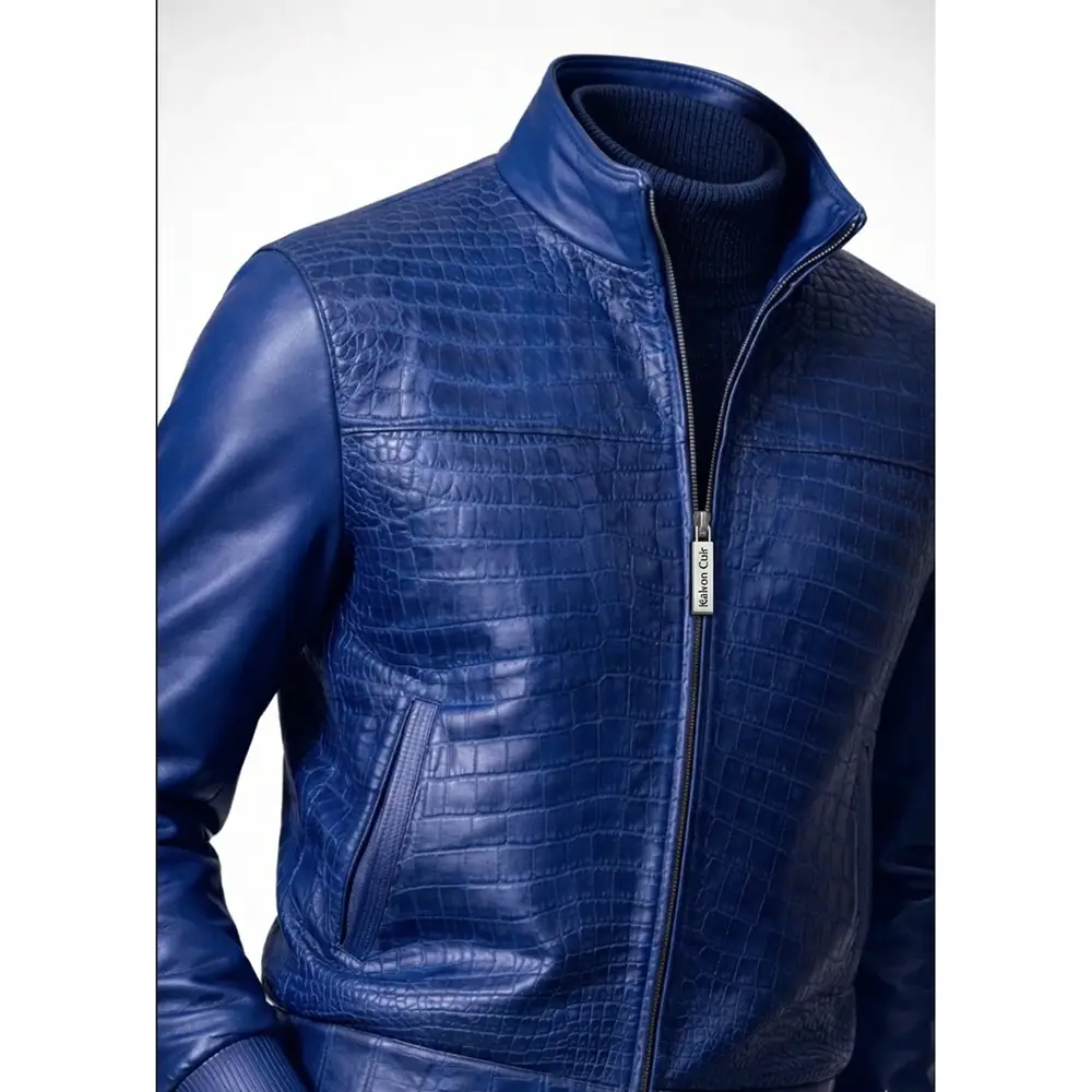 Crafted from high-quality leather, the jacket offers durability, comfort, and a refined appearance. The striking croc-embossed pattern on the front creates a unique textured look, while the solid blue leather sleeves add balance and sophistication. Its rich blue color gives the jacket a contemporary feel that pairs effortlessly with both casual and smart outfits.