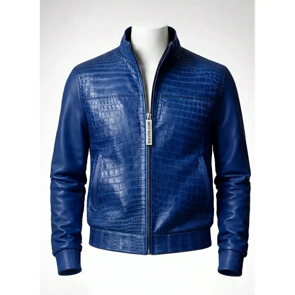 Crafted from high-quality leather, the jacket offers durability, comfort, and a refined appearance. The striking croc-embossed pattern on the front creates a unique textured look, while the solid blue leather sleeves add balance and sophistication. Its rich blue color gives the jacket a contemporary feel that pairs effortlessly with both casual and smart outfits.